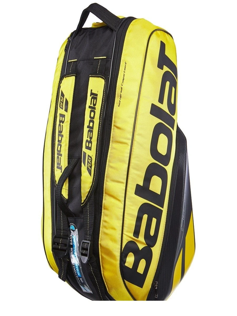 Babolat Pure Aero 6 Pack Tennis Bag has a new color. Features two main compartments that will hold up to three racquets each. One compartment features Isothermal Protection. Has an exterior pocket for shoes, and attached adjustable padded backpack straps.